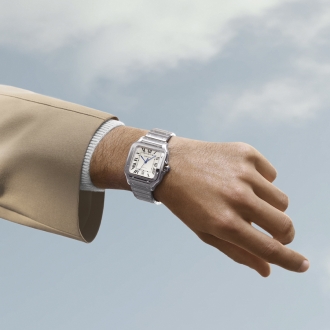 Die Santos de Cartier von 1904 beruht auf vier gestalterischen Prinzipien: Reinheit der Linie, Präzision der Form, Perfektion der Proportionen und edle Details. Das Design verkörpert die Essenz der Cartier Uhrmacherkunst, mit einem quadratischen Zifferblatt, sichtbaren Schrauben und einem perfekt anpassungsfähigen Armband. Das Gehäuse enthält ein skelettiertes Automatikwerk, das die Proportionen intakt lässt. Louis Cartier erfüllte im Jahr 1904 dem Flugpionier Alberto Santos-Dumont seinen Wunsch nach einer modernen Uhr, die schlicht, funktional und innovativ ist. Die Santos de Cartier verkörpert daher nicht nur Tradition, sondern symbolisiert auch den Ehrgeiz von Männern, die nach dem Vorbild von Alberto Santos-Dumont die Welt verändern möchten.