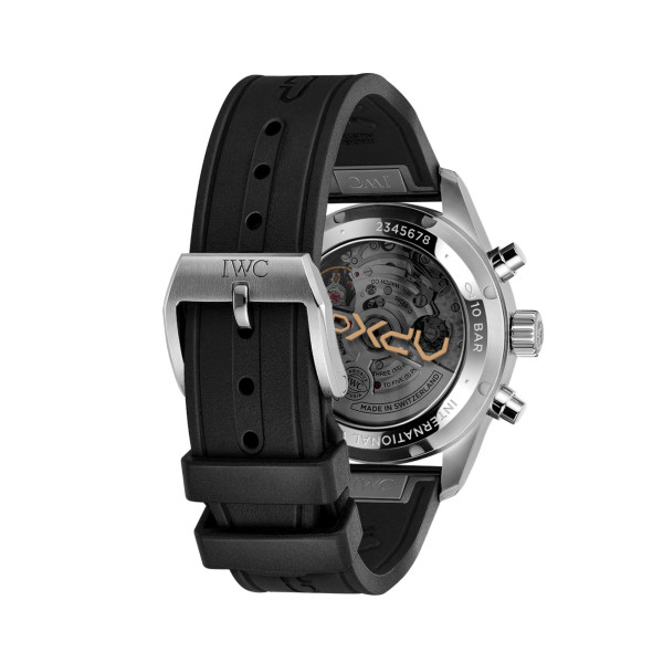 Ref. IW388116 - Die Pilot’s Watch Chronograph 41 APXG ist dem fiktiven „APXGP“-Team aus dem Film F1® gewidmet. Sein Farbcode in Schwarz, Weiss und Gold ist von den Farben des Teams inspiriert. Das 41 Millimeter grosse Edelstahlgehäuse wird mit einem schwarzen Zifferblatt kombiniert, das mit weissen Ziffern und goldenen Minutenzählern bedruckt ist. Die Minuten- und Stundenzeiger sowie die Zeiger der Hilfszifferblätter sind vergoldet und mit weisser Super-LumiNova® gefüllt.