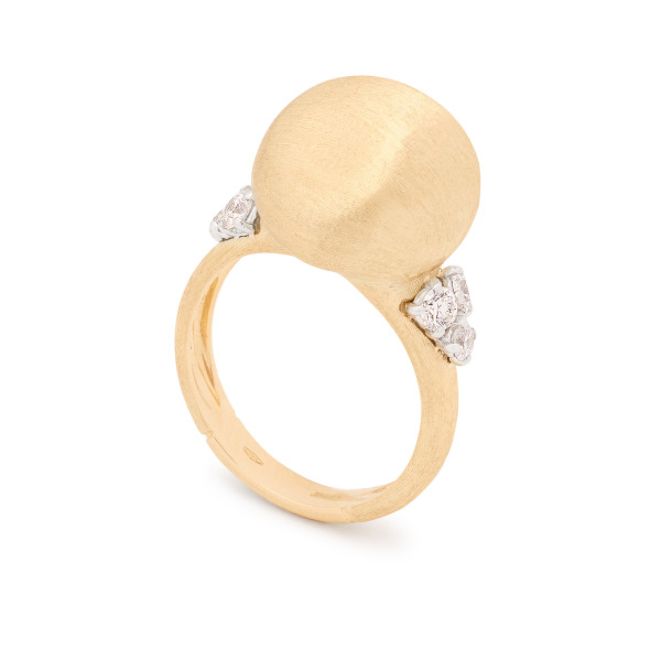 Ref. AB655 B YW - Dieser Ring aus Gelbgold mit 18 Karat mit einer unregelmäßigen, seidigen Oberfläche ist in einer antiken Technik mit dem Fadenstichel von Hand fein graviert. Die Ringschiene ist auf jeder Seite mit drei Diamanten im Brillantschliff veredelt, die ein zartes florales Motiv bilden und einen glamourösen Akzent setzen.