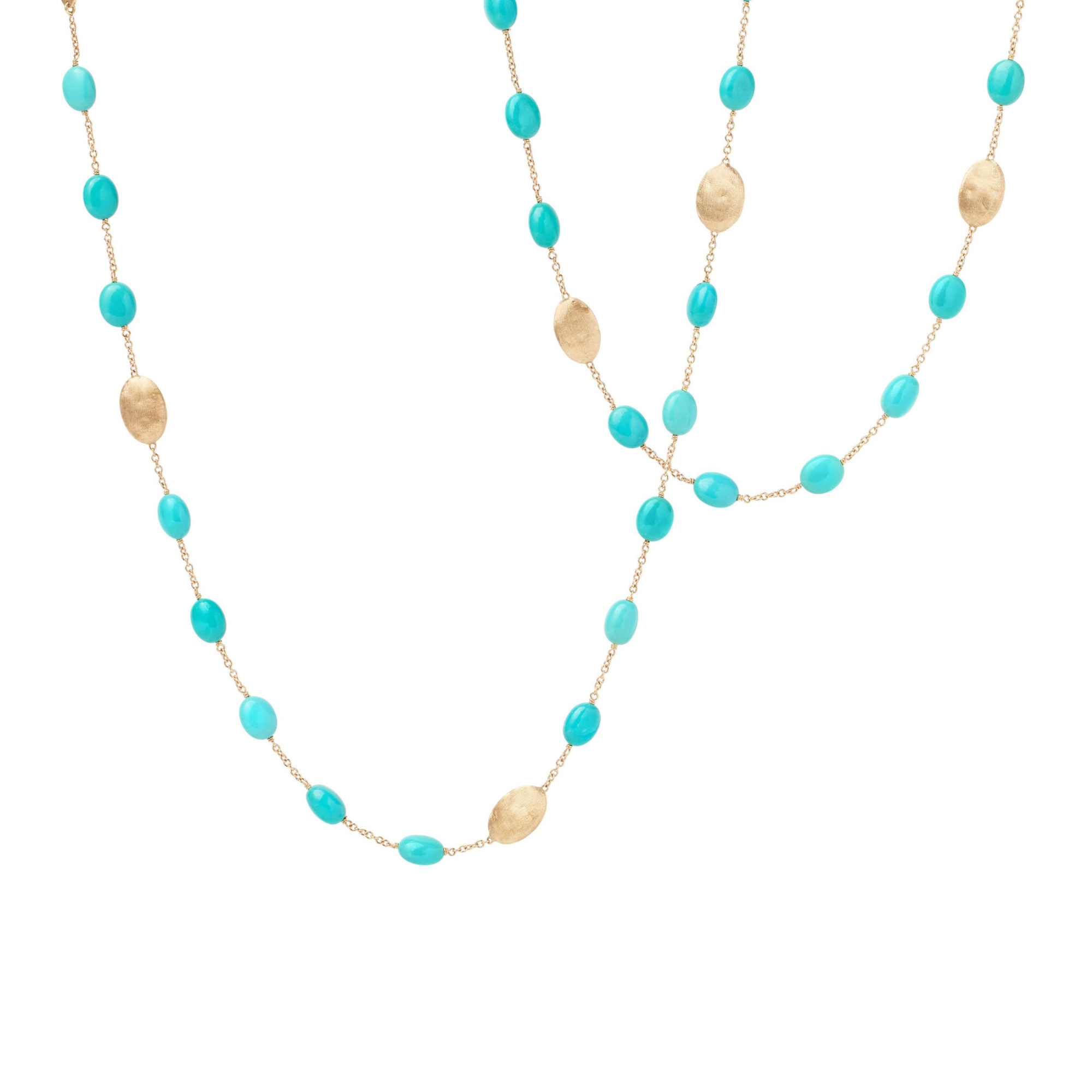 Ref. CB2770 TU01 Y - Bei diesem sehr femininen Sautoir wechseln sich winzige ovale Perlen aus 18-karätigem Gelbgold, die in der alten florentinischen Technik von Hand graviert wurden, mit bezaubernden ovalen Cabochon-Türkis-Edelsteinen ab. Elegant und raffiniert, kann es jedem Ensemble einen Hauch von Sommerflair verleihen.