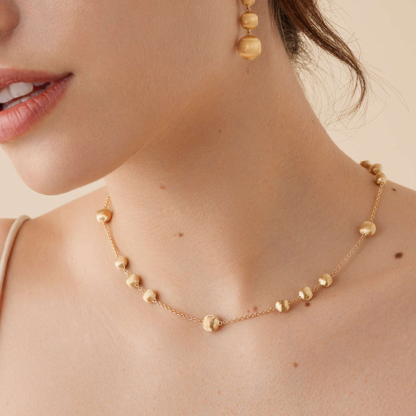 Ref. CB2830 Y - Diese atemberaubende Halskette zeichnet sich durch ihre abwechselnde Abfolge von Perlen aus 18 Karat Gelbgold aus. Die unregelmäßige Oberfläche wird mit der alten florentinischen Technik fein von Hand graviert, was dem Gold eine feine, gebürstete Textur verleiht. Tragen Sie diese Halskette allein oder mit Ketten in verschiedenen Längen für einen gehobenen Look.