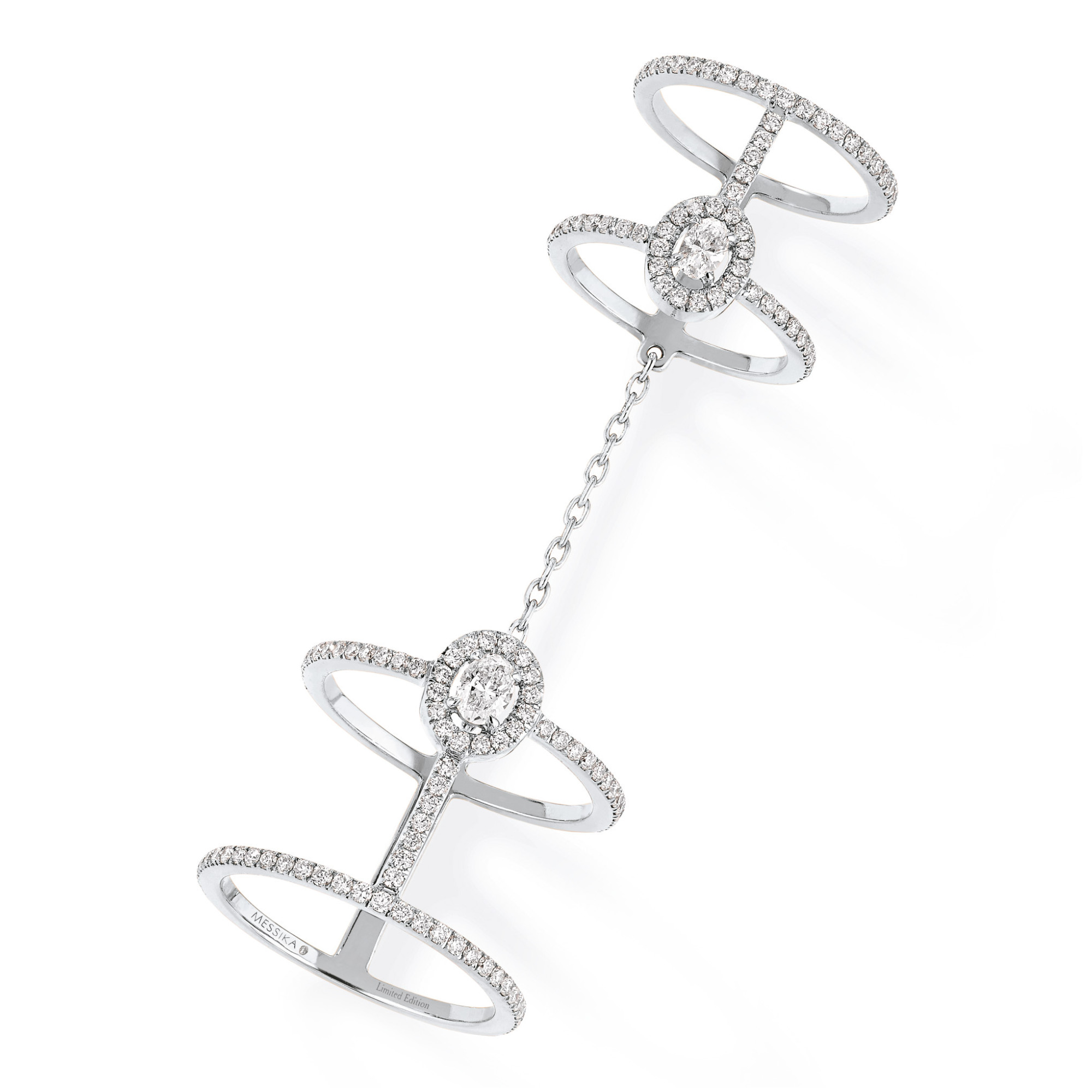 Ref. 05671-WG - Entdecken Sie den doppelten, mit Diamant ausgefassten Glam‘azone Ring aus Weißgold. Der Glanz des Weißgoldes verstärkt die Reinheit der Diamanten und betont so ihr atemberaubendes Schillern. Ein zentraler Diamant im Ovalschliff schillert umgeben von Diamanten. Dank seines ausgeklügelten Systems mit einer abnehmbaren Kette bietet er mehrere Tragemöglichkeiten: auf dem Zeigefinger, auf dem Ringfinger, auf dem Mittelfinger ... Zusammen oder einzeln ... Ganz nach Lust und Laune. Ein Ring im Einklang mit der Frau von heute – frei, strahlend und facettenreich.