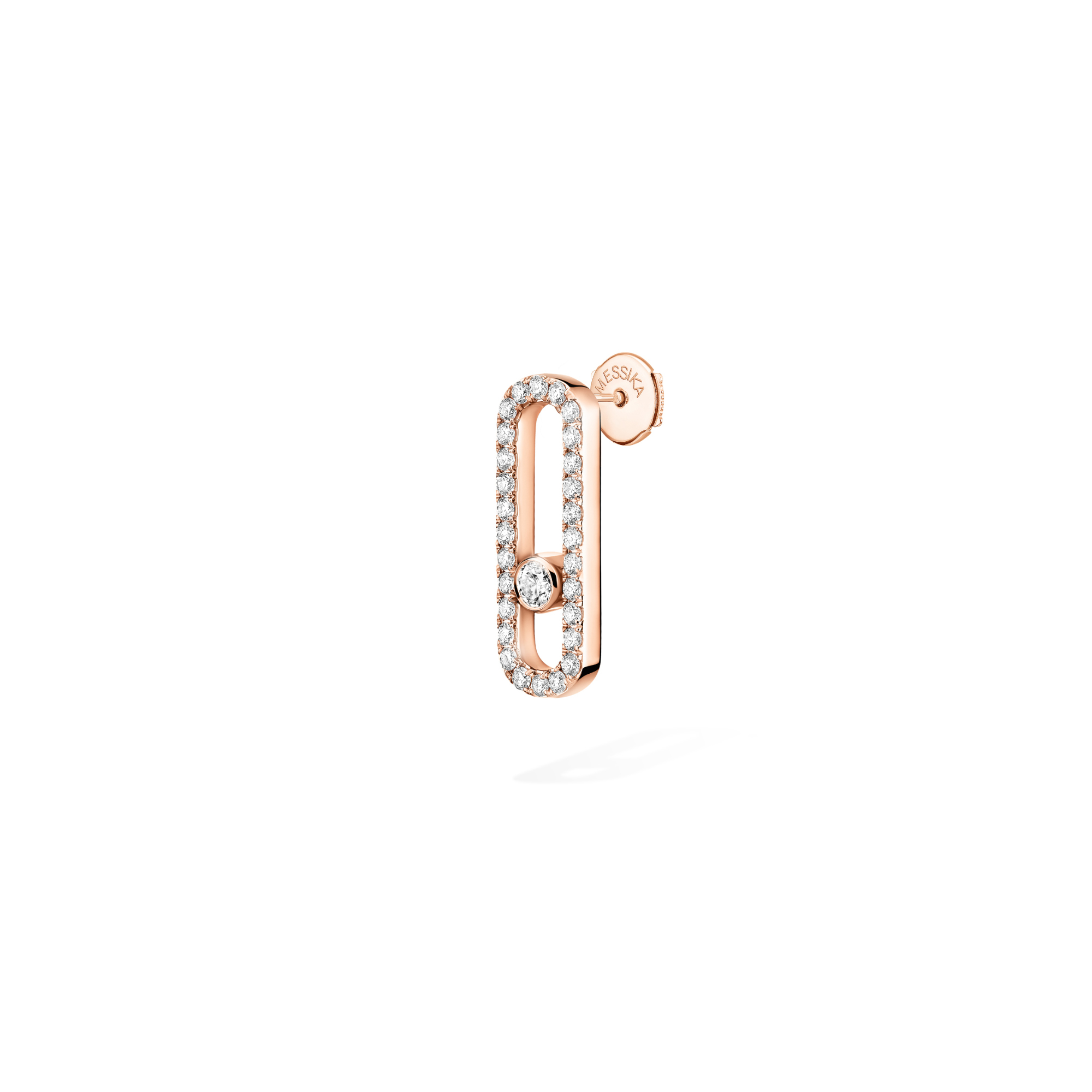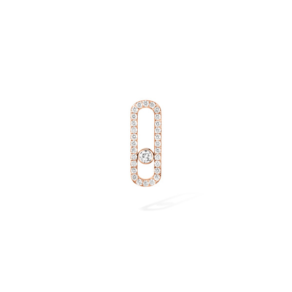Ref. 12063-PG - Dieser einzelne Ohrring wurde für das linke Ohr entworfen. Move Uno ist eine Kollektion mit einem grafischen und minimalistischen Design, die den Glanz eines beweglichen Diamanten veredelt, und eine wahre Messika Ikone. Dieser mit Diamanten ausgefasste einzelne Ohrring aus 18 Karat Roségold interpretiert Move in einem großzügigeren Format und bietet eine schöne Präsenz beim Tragen. Mit seinem schrägen Schaft sitzt dieses Damenschmuckstück aus Roségold perfekt auf dem linken Ohrläppchen. Ob allein oder in Kombination mit einem Ohrstecker bietet dieses Luxusschmuckstück dank seiner zeitlosen und klaren Linien eine große Vielfalt an Stilen.