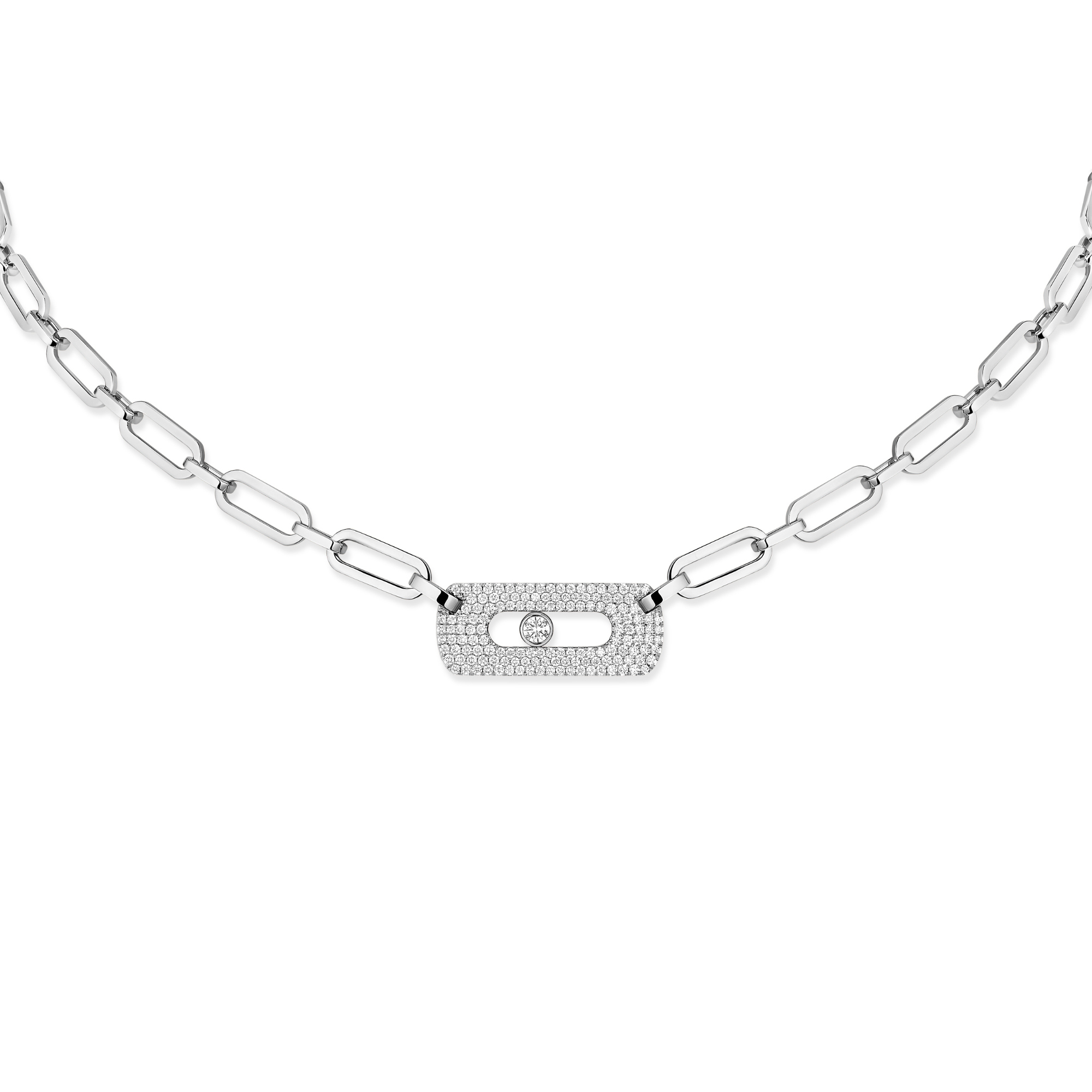 Ref. 12095-WG - Selbstbewusst, kühn und feminin: Diese eng anliegende Move Link Diamantkette aus Weißgold hat alles, um zu gefallen. Die handgefertigte XXL-Kette aus 18 Karat Weißgold erinnert an die Gliederketten der 1960er Jahre. In der Mitte das unverkennbare Motiv der Maison mit seinem beweglichen Diamanten, dem Markenzeichen von Messika. Klare Linien, präzise Proportionen und kostbare Details sind Werte, die der Gründerin Valérie Messika am Herzen liegen und die sich an dieser Halskette wiederfinden, die sich perfekt für einen grafischen und äußerst trendigen Look eignet.