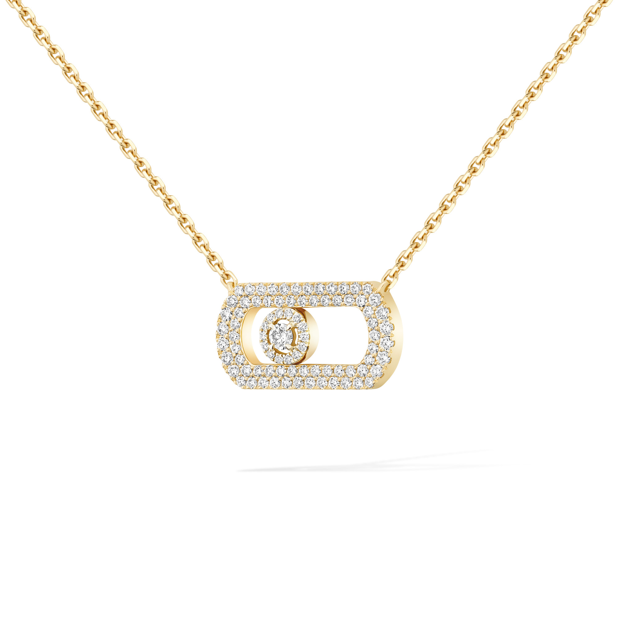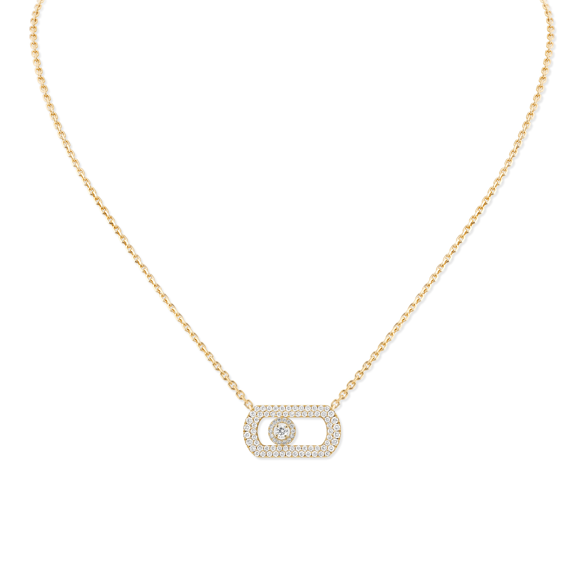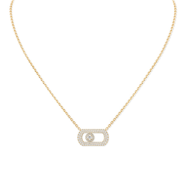 Ref. 12945-YG - Es ist die Ikone von Messika: Das Move und sein beweglicher Diamant haben der Maison seit 2005 zum Erfolg verholfen. Dieses Symbol, das immer wieder neu erfunden und interpretiert wird, erhält mit der So Move Schmuckkollektion eine neue Dimension. Noch selbstbewusster, noch skulpturaler, noch verwegener! Der bewegliche Diamant gönnt sich XXL-Konturen und einen mit kleineren Diamanten ausgefassten Halo, der ihn strahlend in Szene setzt und ihn zum Star macht! Der vollständig mit Diamanten ausgefasste Anhänger dieser So Move Halskette wird all jene verführen, die eine unverwechselbare Statement-Diamantkette für ihre nächsten Looks suchen. Ob Tag oder Nacht, wir wetten, dass dieses Luxusjuwel Ihnen nicht mehr von der Seite weichen wird!