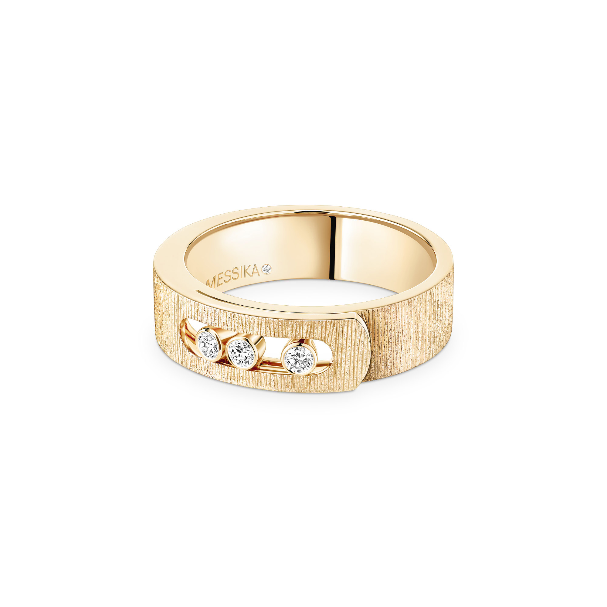 Ref. 14482-YG - Der schimmernde und sinnliche Move Noa Ring aus ziseliertem Gelbgold und Diamanten hüllt den Finger in einen nie dagewesenen Glanz. Die Raffinesse des ziselierten Gelbgoldes, das perfekt mit der Bewegung der Diamanten harmoniert, verleiht diesem Luxusschmuckstück von Messika ein Spiel mit Material und Kontrast. Die von Hand eingravierten Goldstreifen verleihen eine neue Textur, die der Welt der Couture und der Mode ähnelt: ein seidensamtener Effekt, der das Licht einfängt und unendlich reflektiert.