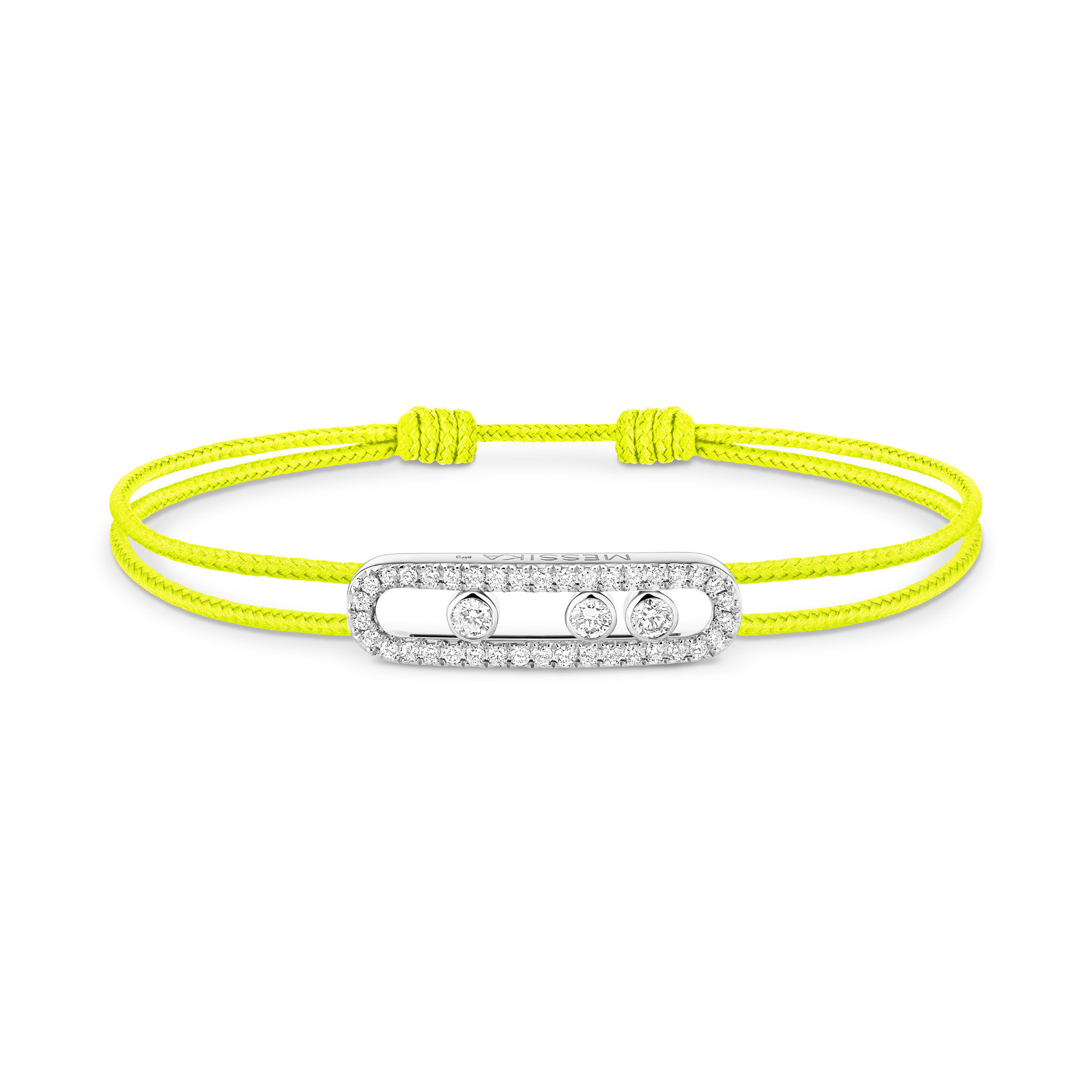 Das originelle und engagierte MESSIKA CARE(s) Armband aus Weißgold mit neongelber Schnur ist eine Neuinterpretation des Move-Motivs in einer magnetischen mit Diamanten ausgefassten Version. Sein heller, intensiver Glanz zieht sofort die Blicke auf sich und die drei beweglichen Diamanten unterstreichen stilvoll den Look. MESSIKA CARE(s) ist eine solidarische Schmuckkollektion und somit ein höchst symbolischer strahlender Akzent. Für jedes verkaufte Gold- und Diamantschmuckstück spendet die Maison einen Teil des Gewinns über die Valérie Messika Stiftung an internationale Organisationen und NGOs, die sich für Kinder in den Bereichen Bildung und Gesundheit einsetzen.