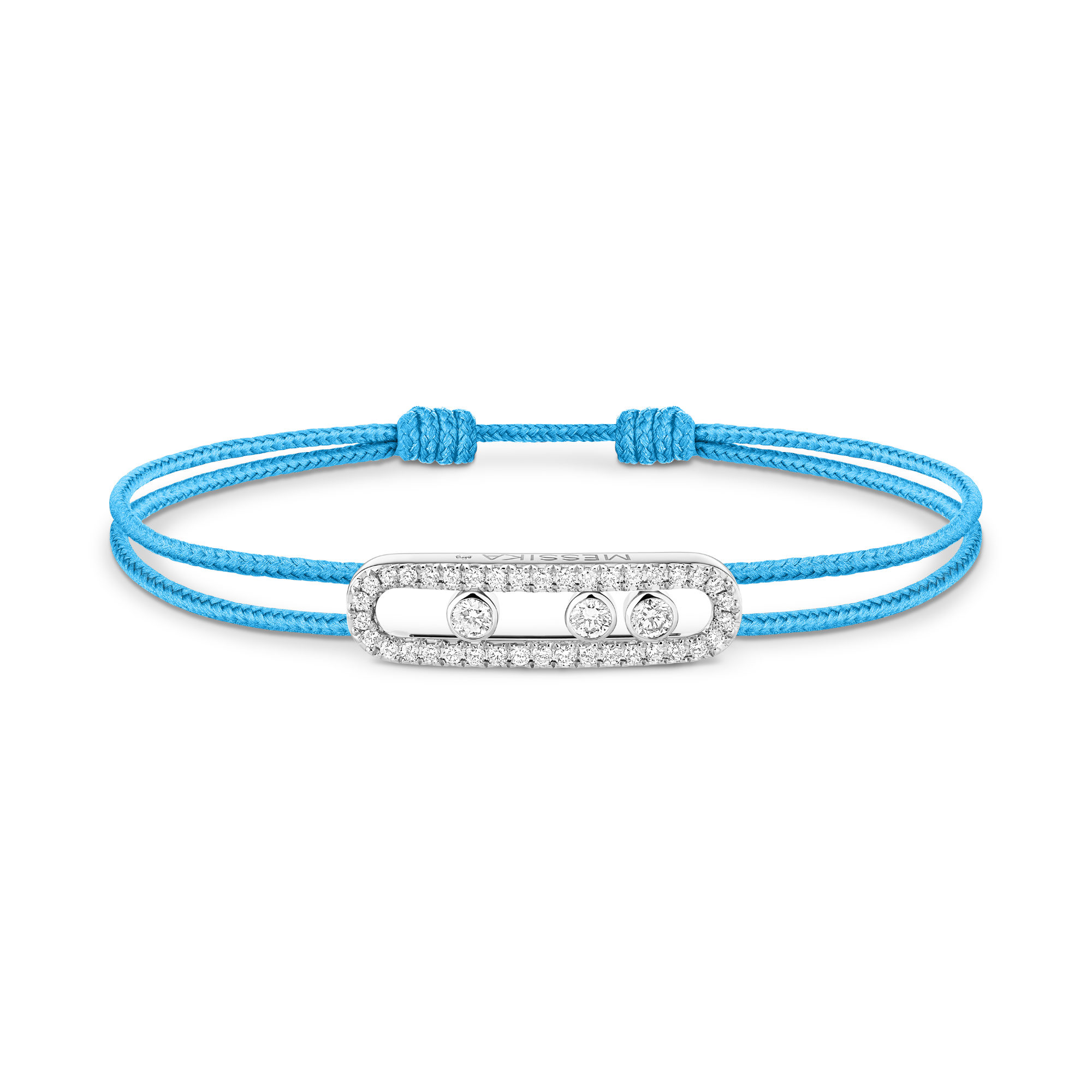 Ein einzigartiges Design und ein unnachahmliches Markenzeichen: Das Move-Motiv zeigt sich mit dem Messika CARE(s) Diamantarmband mit Schnur in einer neuen Gold- und Farbkombination. Diese mit Diamanten ausgefasste Version aus Weißgold mit blauer Schnur schmückt das Handgelenk mit Charakter und Glanz. Das Diamantarmband aus Weißgold ist leicht zu tragen und passt sich dank der verschiebbaren Glieder perfekt an Ihre Größe an. Dieser leuchtende Farbtupfer spiegelt schöne Botschaften wider. Mit der Messika CARE(s) Schmuckkollektion wird ein Teil des Verkaufserlöses zur Unterstützung internationaler Organisationen und NGOs verwendet, die sich für Kinder in den Bereichen Bildung und Gesundheit einsetzen.