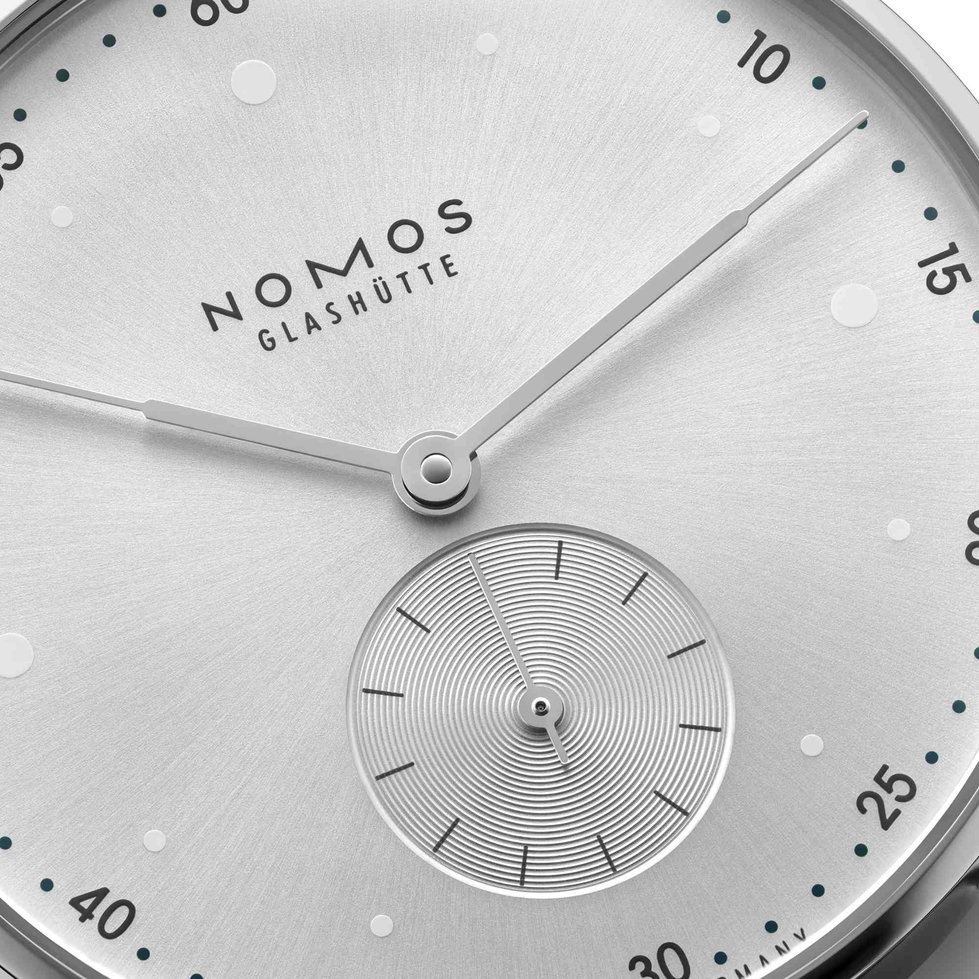 Ref. 1122.SB - All Silver wie die Fronten von Bürotürmen in den Schluchten der Großstadt – alles Glas, Edelstahl und nein: kein Beton, dafür ein hochwertiges Band aus veganem Velours in Samtgrau. Der Minutentakt spielt die Hauptrolle im Design von Metro, die langen, geraden Zeiger sind wie das Empire State Building gestuft. Mit Handaufzugskaliber Alpha aus Glashütter Manufaktur und in der smarten Größe von nur 33 Millimeter Durchmesser.