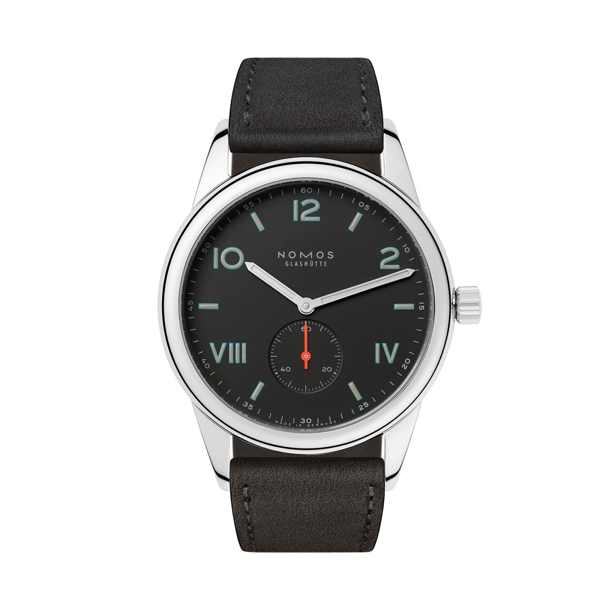 Zeiger: Stunden- und Minutenzeiger rhodiniert und mit Superluminova ausgelegt (blau nachleuchtend); Sekundenzeiger neon-orange