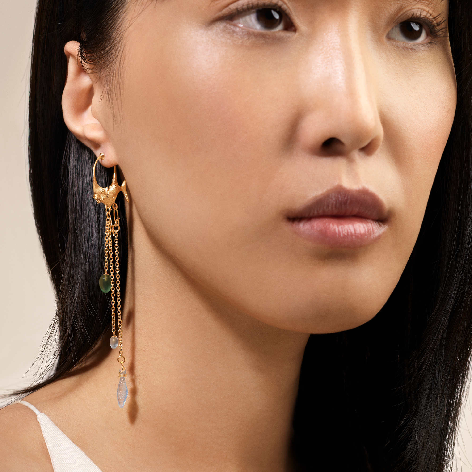 Ref. A3159-401 - Von Sofia Lynggaard Normann entworfen. Dieser Young Fish-Ohrringanhänger ist aus 18-karätigem Gelbgold gefertigt und mit einem Aquamarin und einem Serpentin in Tropfenform versehen. Die Gesamtlänge des Anhängers beträgt 5,3 cm. Wird als Einzelstück verkauft. Teil der Young Fish-Kollektion.
