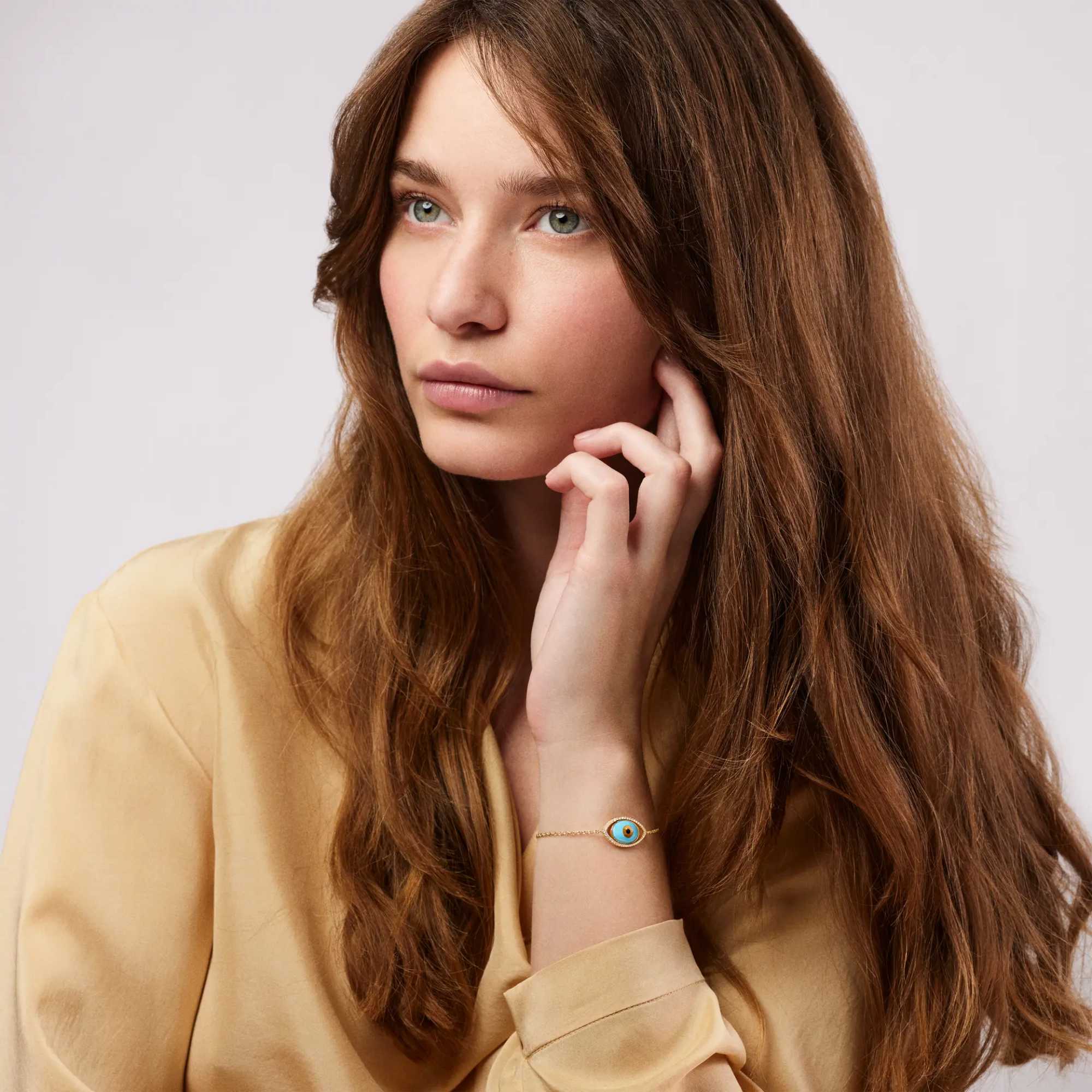 Ref. A3259-401 - Dieses Armband wurde von Charlotte Lynggaard entworfen und ist mit einem Evil Eye verziert. Der Evil Eye ist aus Tigerauge, Türkis und Onyx gefertigt und von 42 Diamanten mit insgesamt 0,25 Karat umgeben. TW/VS. Das Armband, Anker 40, ist aus 18k Gelbgold gefertigt. Es misst 18 cm und verfügt über Ösen, sodass es bei 15, 16, 17 oder 18 cm getragen werden kann. Das verstellbare Ende des Armbands ist mit einer zierlichen Sternschnuppe verziert, die aus 6 Diamanten mit insgesamt 0,03 Karat besteht. TW VS, für einen besonders eleganten Glanz. Von Goldschmiedemeistern in Handarbeit gefertigt. Teil der Shooting Stars-Kollektion.