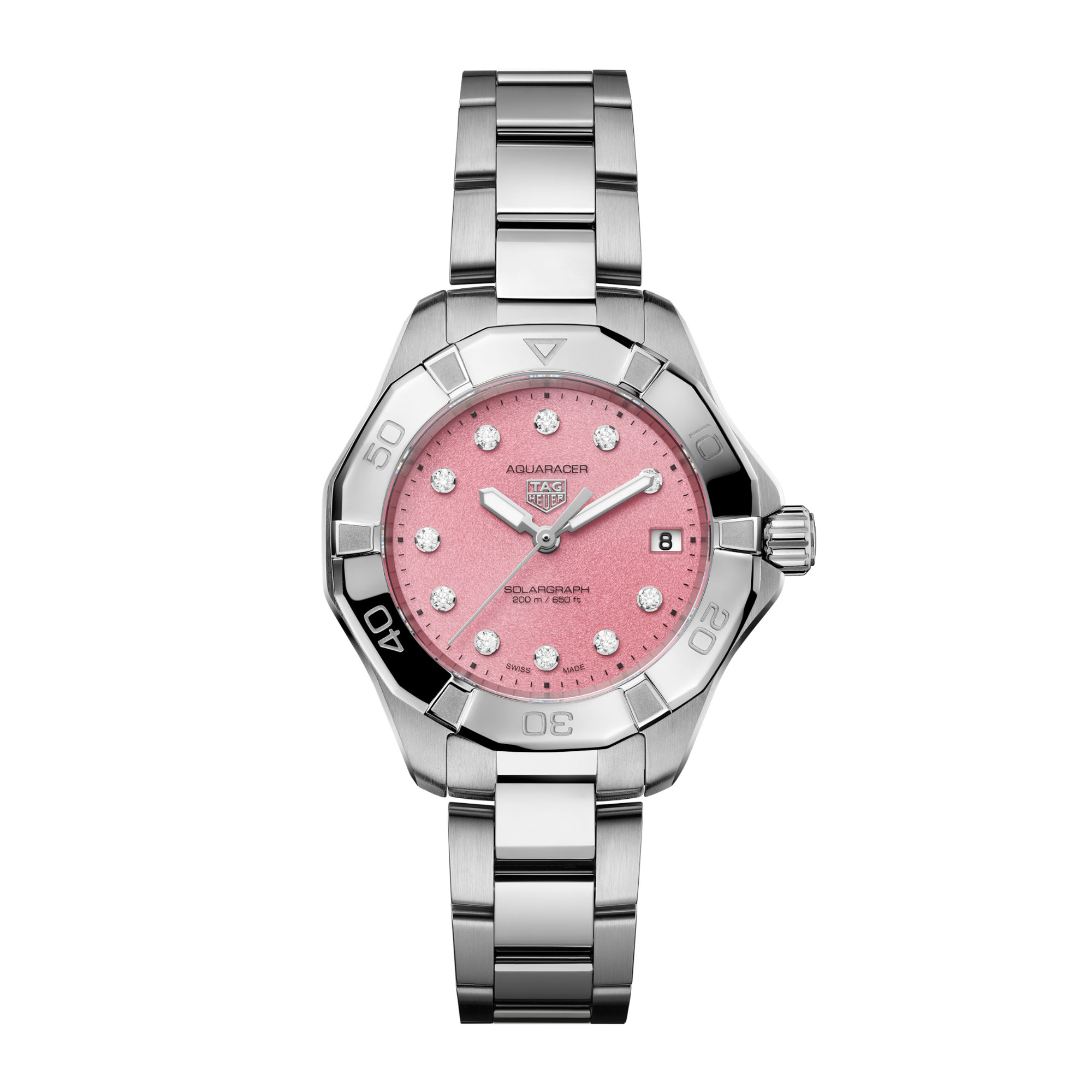 Ref. WBP1318.BA0005 - Die TAG Heuer Aquaracer Professional 200 Solargraph vereint Eleganz und Leistung und bietet eine raffinierte Interpretation der vielseitigen Funktionsuhr der Maison. Das rosafarbene Zifferblatt mit Diamantindizes erinnert an die ätherische Schönheit der Nordlichter und zelebriert Abenteuergeist mit Stil.