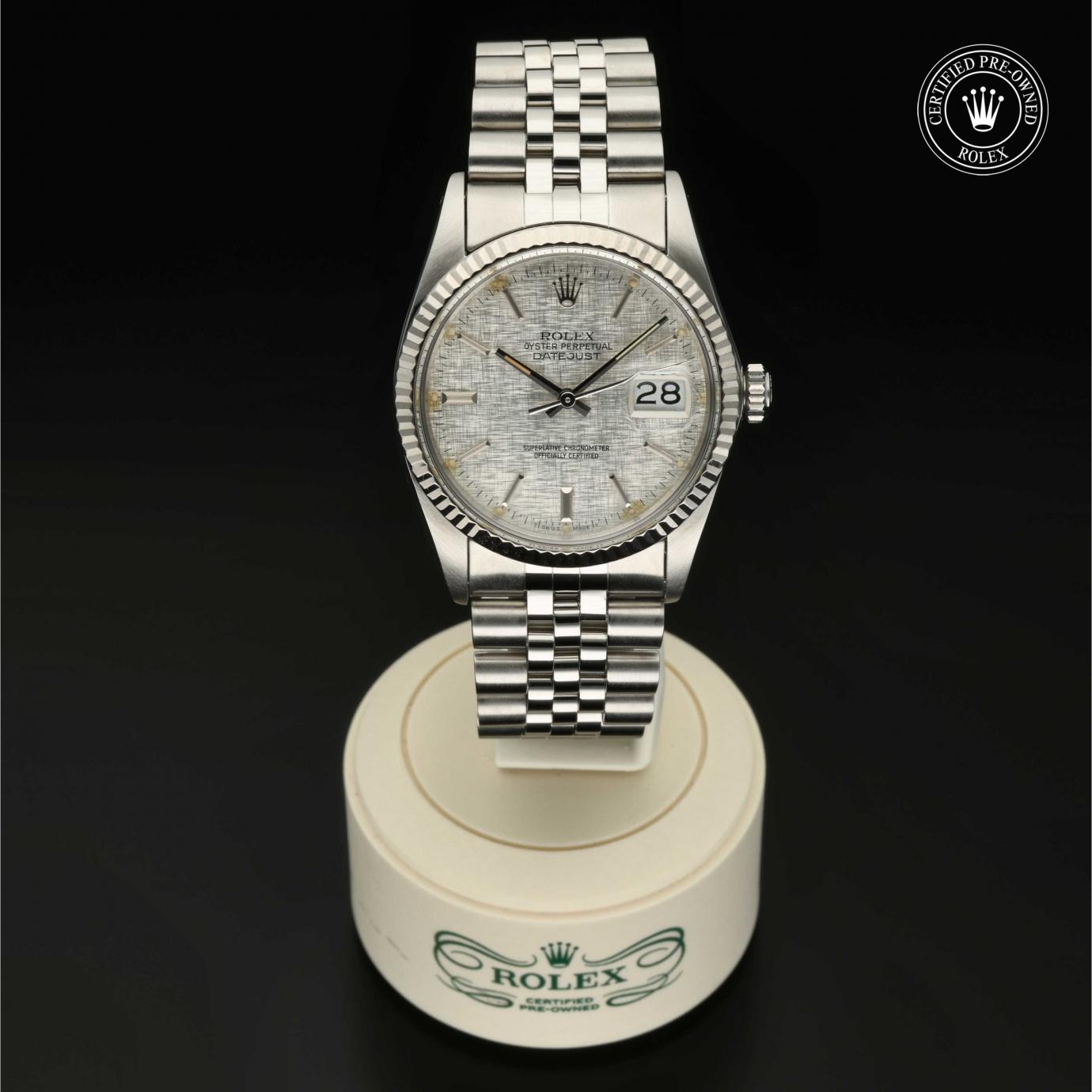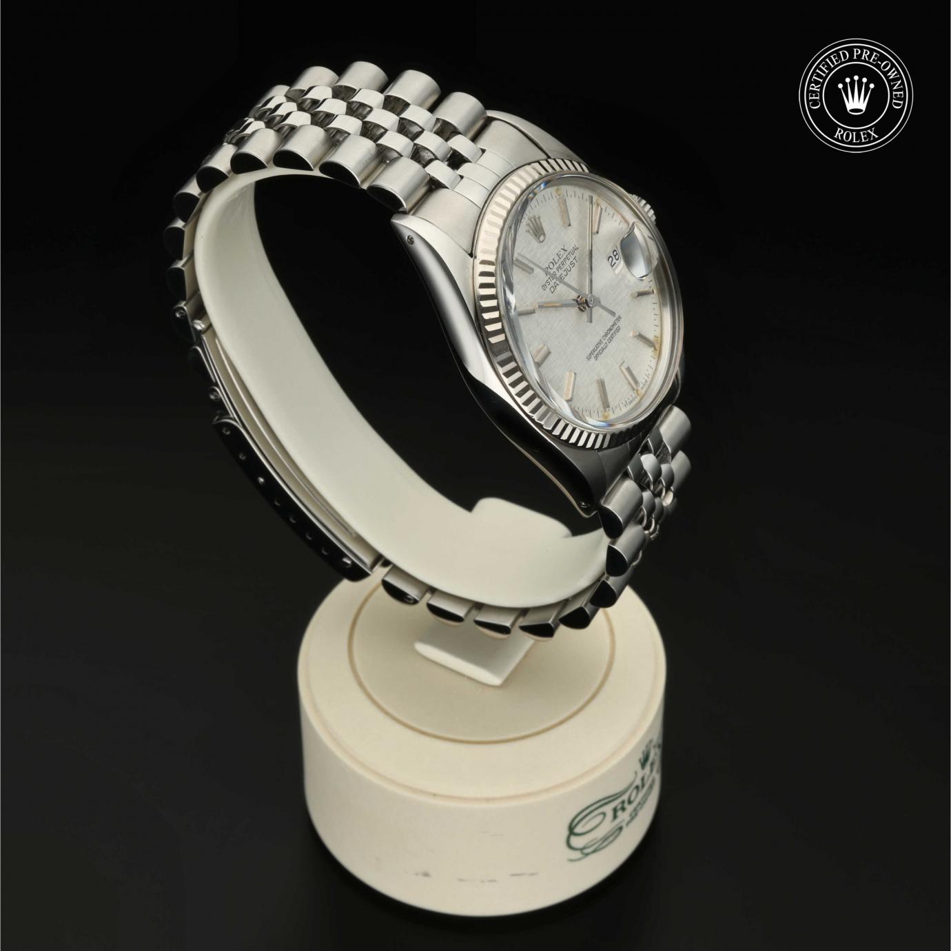 Bei ihrer Einführung im Jahr 1945 war sie das erste automatische und wasserdichte Armbandchronometer, das in einem Sichtfenster auf der 3‑Uhr-Position des Zifferblattes das Datum angibt.Die Datejust ist erhältlich in Edelstahl Oystersteel, als Version in Edelstahl Oystersteel und Gelb-, Weiß- oder Everose-Gold sowie als vollständig in 18 Karat Gold gefertigte Version mit einer großen Auswahl an Zifferblättern, Lünetten und Armbändern. Sie ist ebenfalls in Ausführungen mit Edelsteinbesatz erhältlich.