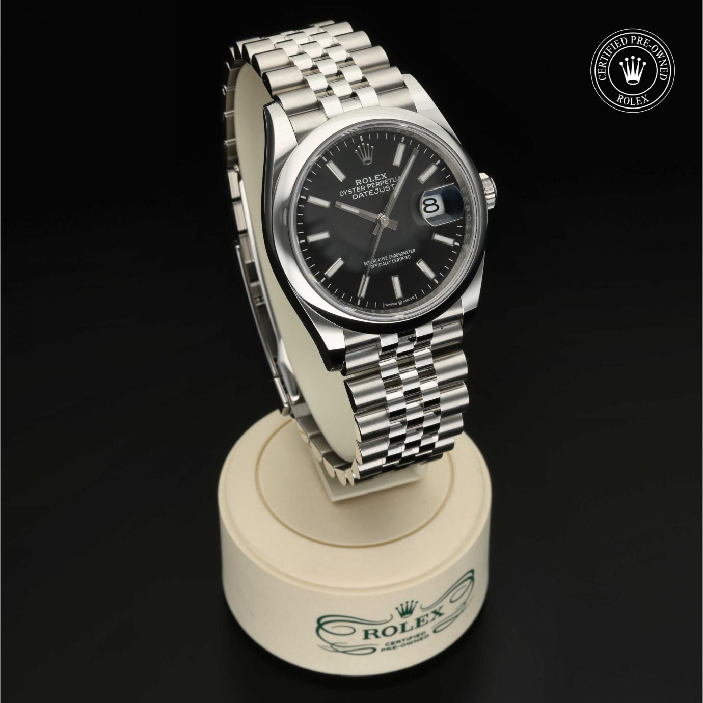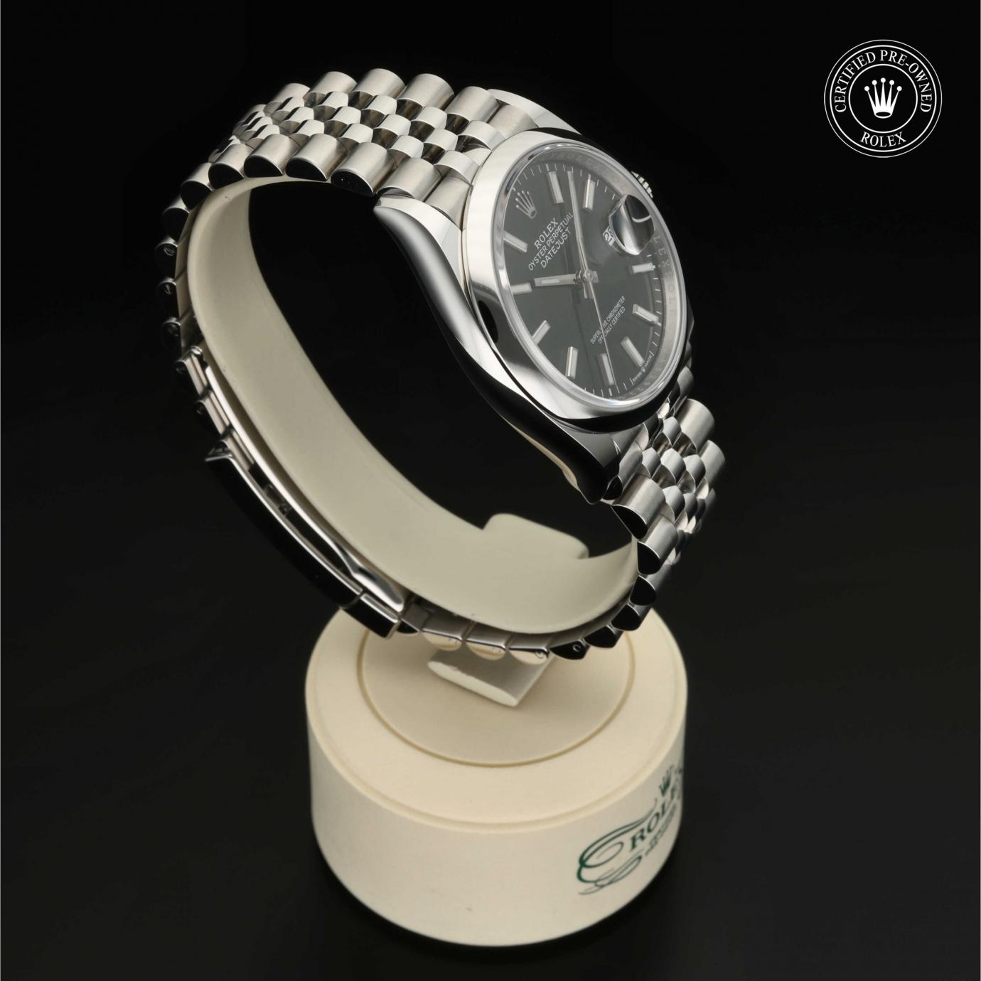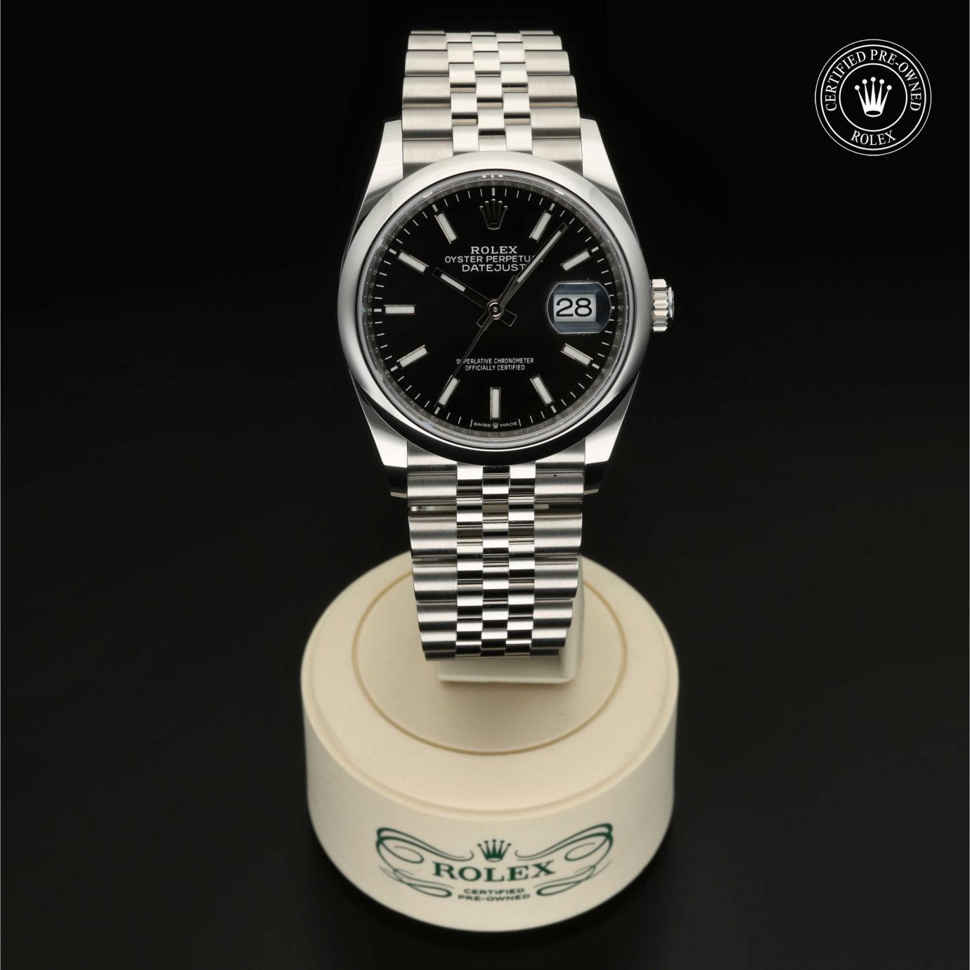 Bei ihrer Einführung im Jahr 1945 war sie das erste automatische und wasserdichte Armbandchronometer, das in einem Sichtfenster auf der 3‑Uhr-Position des Zifferblattes das Datum angibt.Die Datejust ist erhältlich in Edelstahl Oystersteel, als Version in Edelstahl Oystersteel und Gelb-, Weiß- oder Everose-Gold sowie als vollständig in 18 Karat Gold gefertigte Version mit einer großen Auswahl an Zifferblättern, Lünetten und Armbändern. Sie ist ebenfalls in Ausführungen mit Edelsteinbesatz erhältlich.
