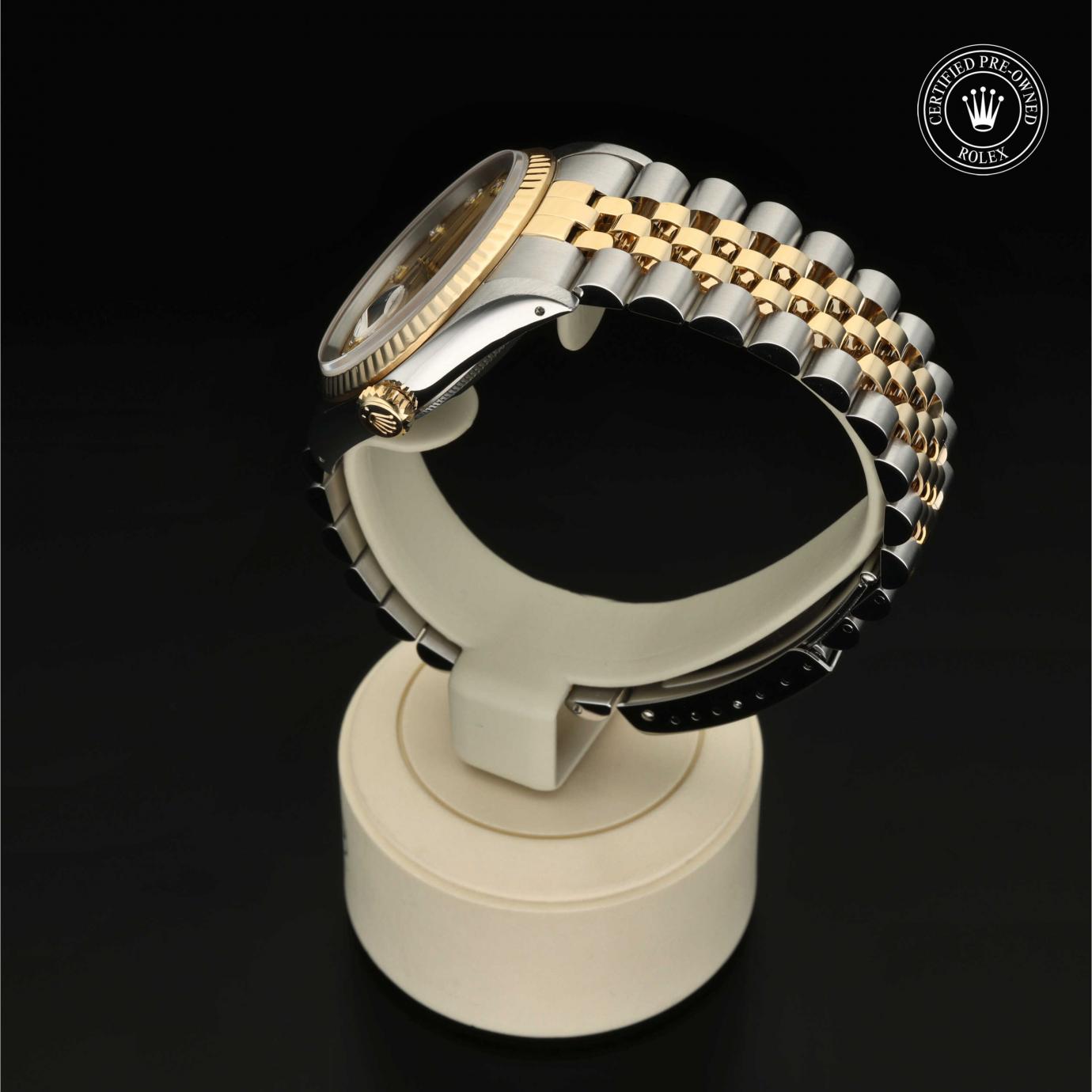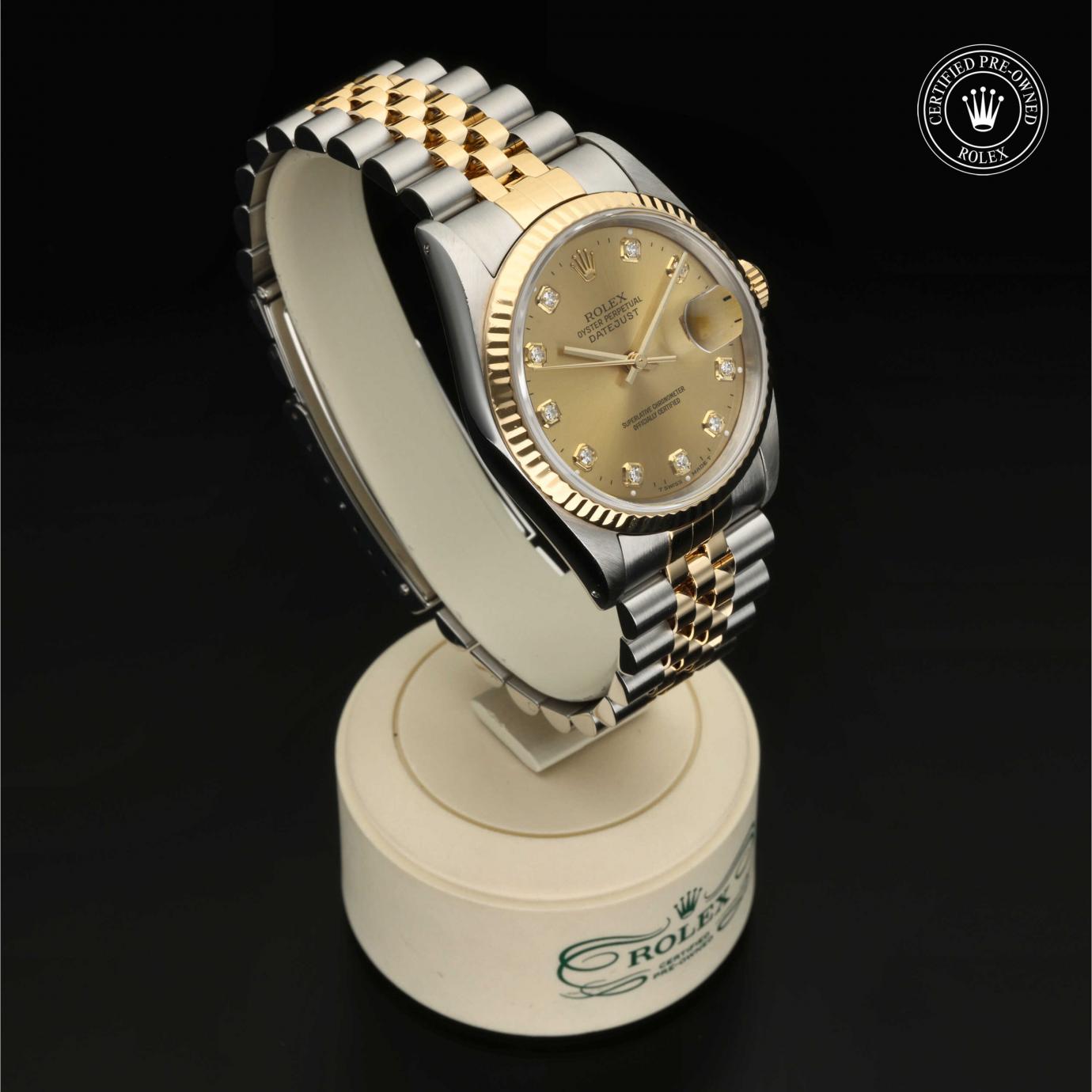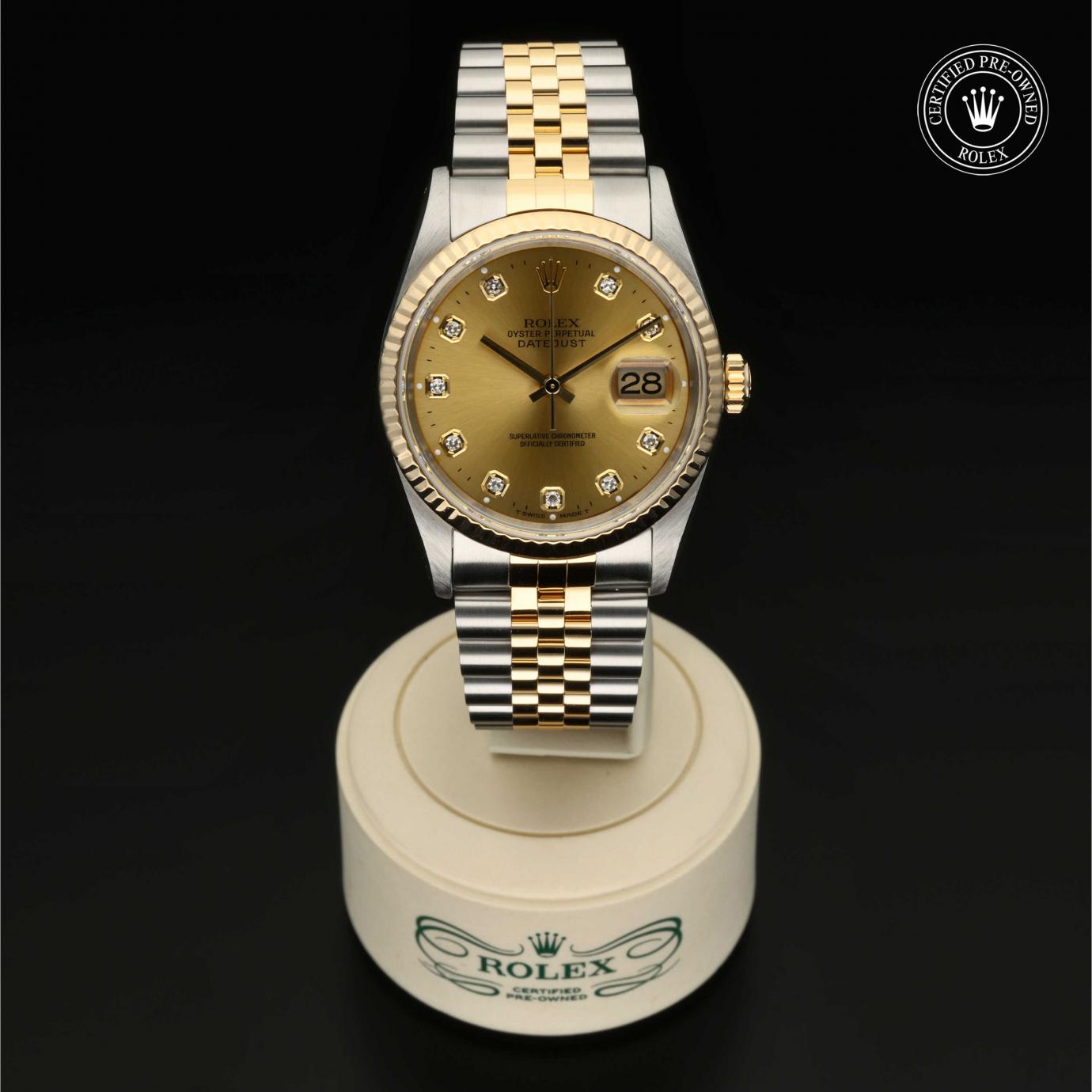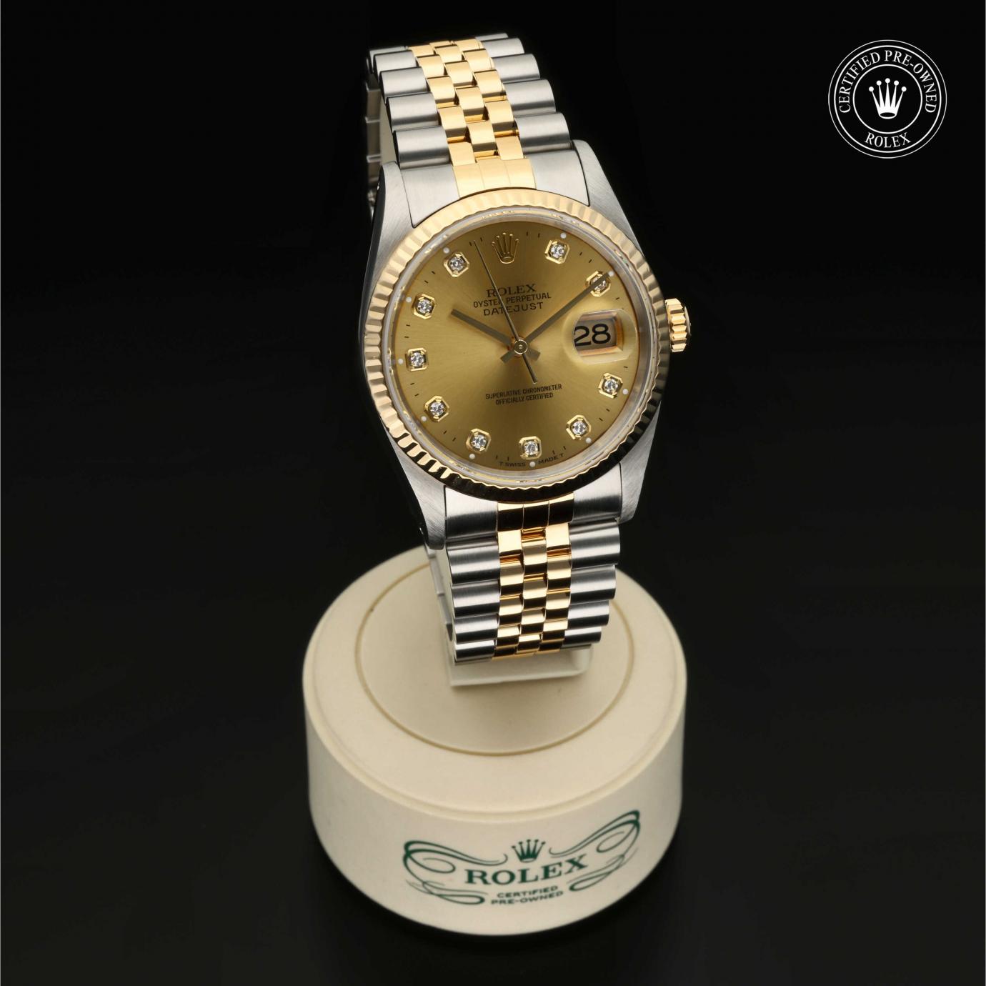 Bei ihrer Einführung im Jahr 1945 war sie das erste automatische und wasserdichte Armbandchronometer, das in einem Sichtfenster auf der 3‑Uhr-Position des Zifferblattes das Datum angibt.Die Datejust ist erhältlich in Edelstahl Oystersteel, als Version in Edelstahl Oystersteel und Gelb-, Weiß- oder Everose-Gold sowie als vollständig in 18 Karat Gold gefertigte Version mit einer großen Auswahl an Zifferblättern, Lünetten und Armbändern. Sie ist ebenfalls in Ausführungen mit Edelsteinbesatz erhältlich.