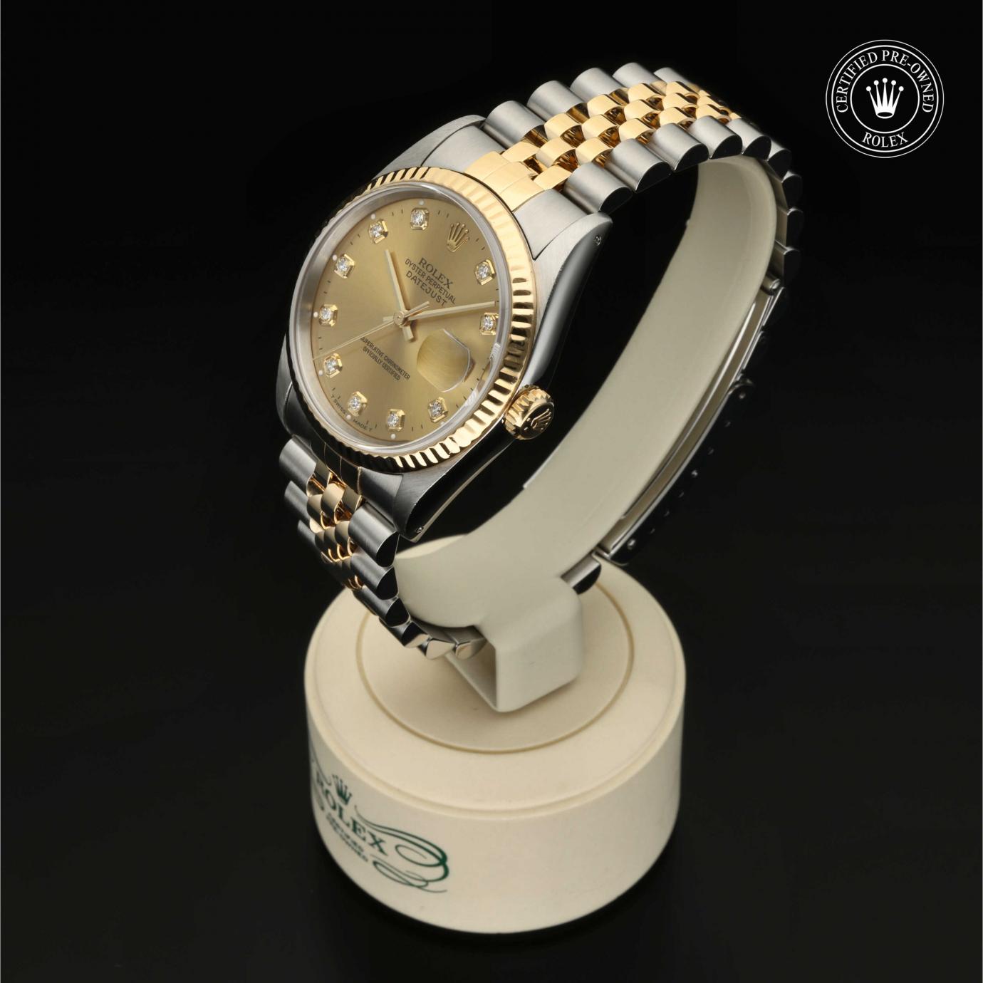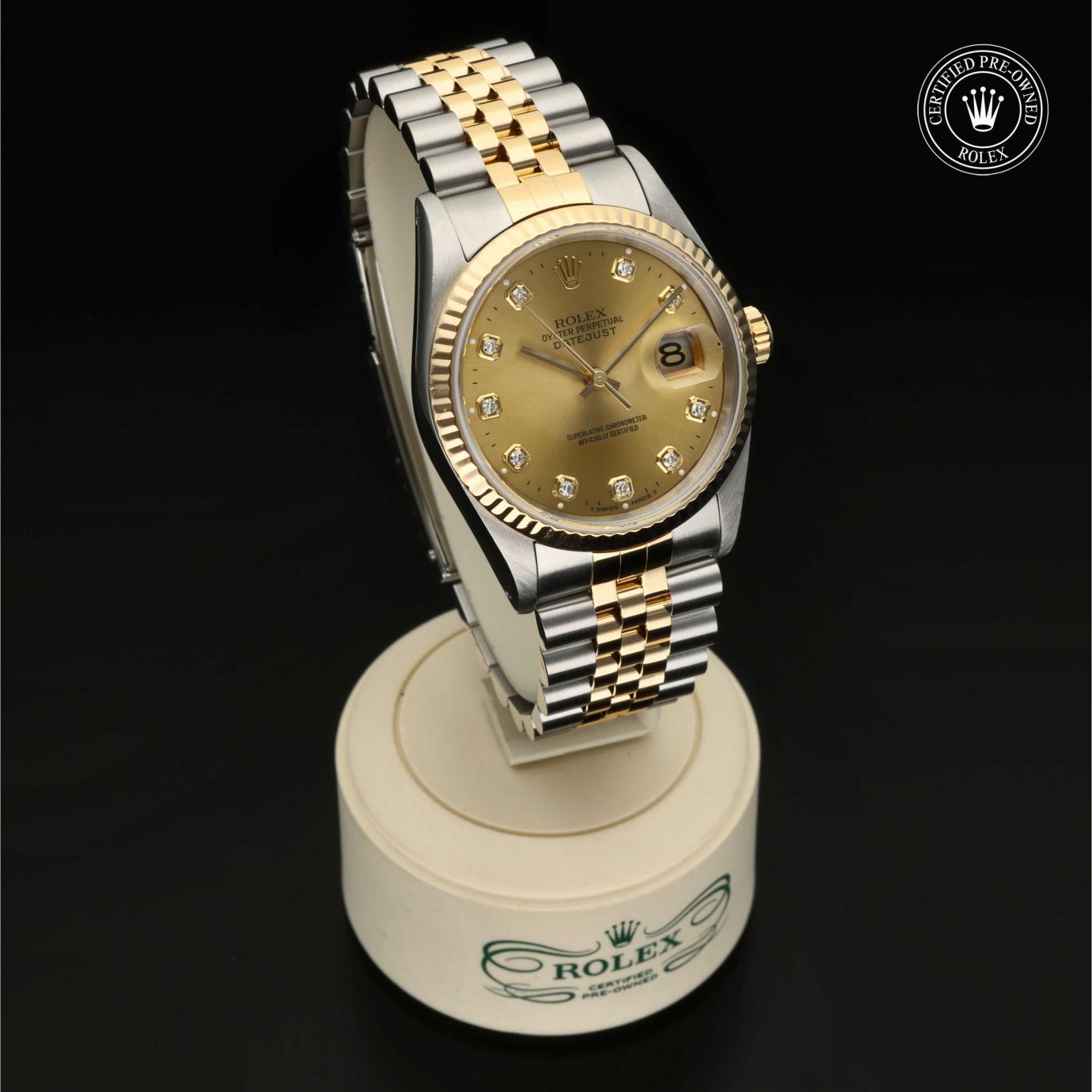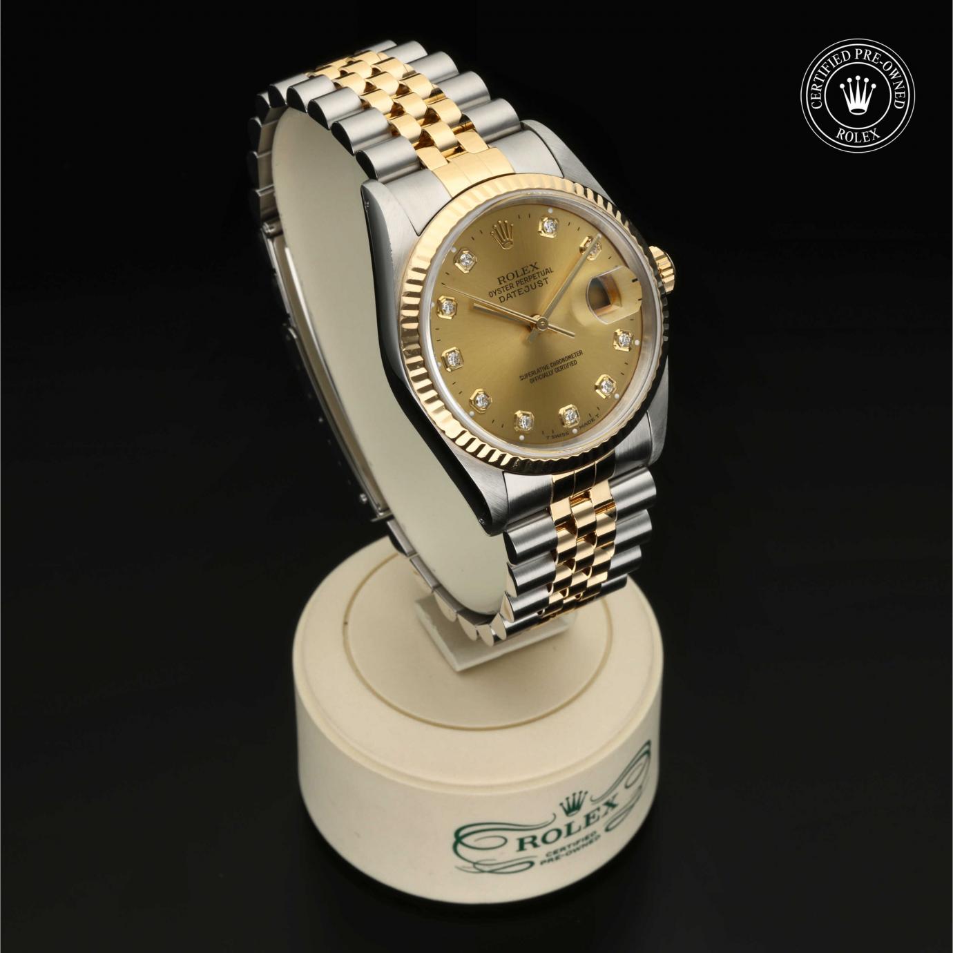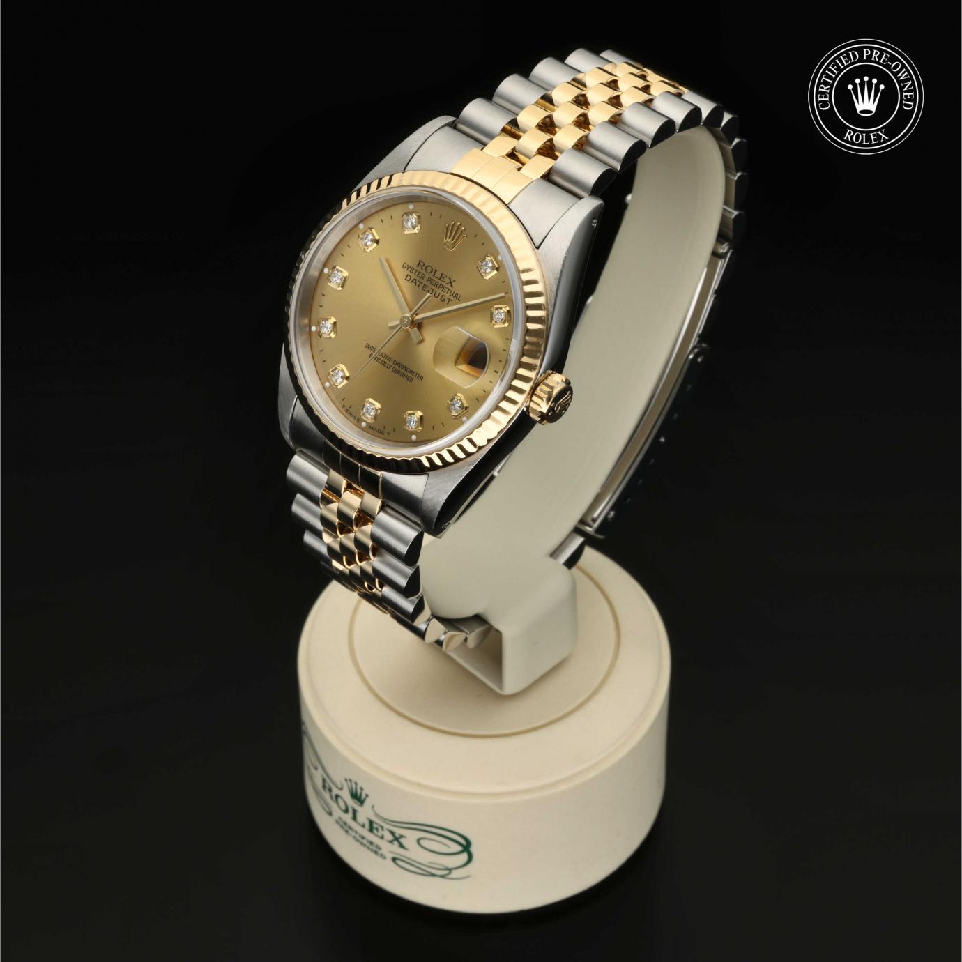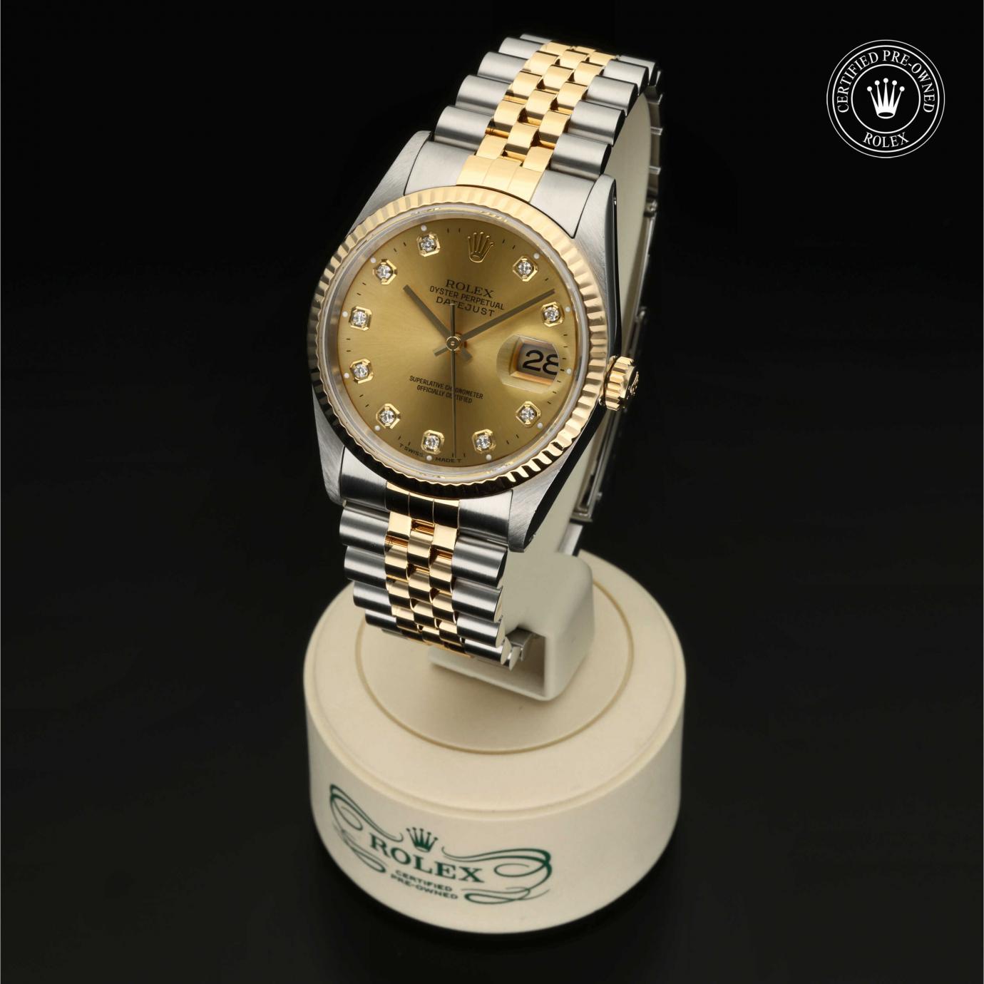 Bei ihrer Einführung im Jahr 1945 war sie das erste automatische und wasserdichte Armbandchronometer, das in einem Sichtfenster auf der 3‑Uhr-Position des Zifferblattes das Datum angibt.Die Datejust ist erhältlich in Edelstahl Oystersteel, als Version in Edelstahl Oystersteel und Gelb-, Weiß- oder Everose-Gold sowie als vollständig in 18 Karat Gold gefertigte Version mit einer großen Auswahl an Zifferblättern, Lünetten und Armbändern. Sie ist ebenfalls in Ausführungen mit Edelsteinbesatz erhältlich.